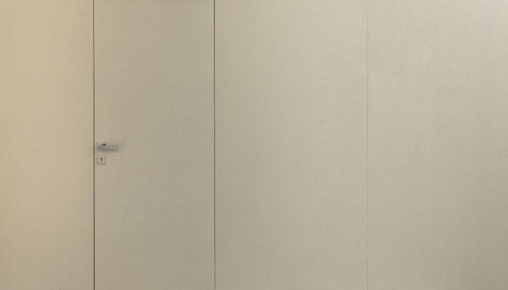 Kluczową cechą tego rozwiązania jest montaż skrzydła drzwiowego w jednej linii ze ścianą, dzięki czemu drzwi stają się niemal niewidoczne na pierwszy rzut oka. Rezultat to gładka powierzchnia bez wyraźnej ramy, która wtapia się w otaczającą przestrzeń. Drzwi bez ościeżnicy najczęściej towarzyszą tej koncepcji, umożliwiając estetyczne ukrycie przejścia do kolejnych pomieszczeń.